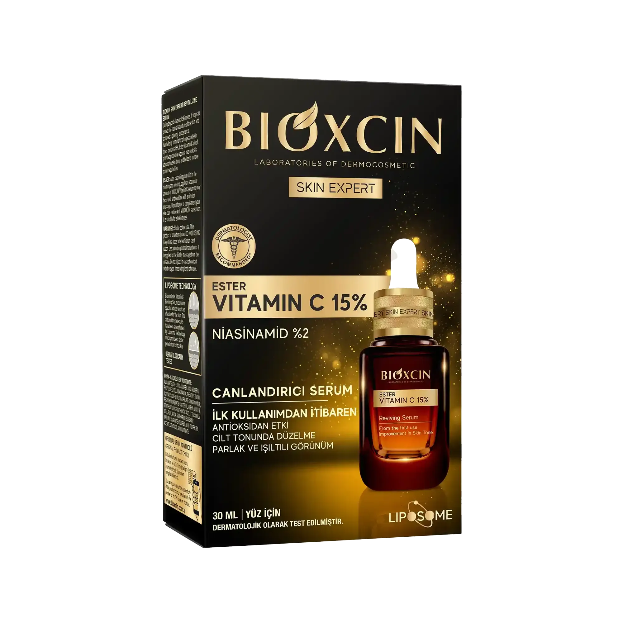 Bioxcin Ester Vitamin C revitalizirajući serum pruža antioksidativni efekat, poboljšanje tonusa kože i blistav i blistav izgled od prve upotrebe. Nadilazi klasičnu njegu kože, čuvajući prirodnu strukturu kože i postizanje blistavog izgleda. Formuliran da bude prikladan za sve uzraste i sve tipove kože, revitalizirajući serum štiti kožu od slobodnih radikala s ester vitaminom C, koji ima visoku stopu od 15%, dok sprječava nepravilnosti boje u tonu kože.