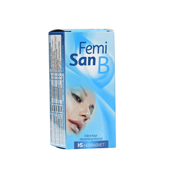 Femisan B je prirodna formulacija namenjena otklanjanju tegoba u menopauzi. Odabrano lekovito bilje čini ovaj proizvod jedinstvenim, jer pored uklanjanja neugodnih problema menopauze, Femisan B preventivno deluje protiv bolesti koje se često javljaju u menopauzi kao što su arterioskleroza, osteoporoza, visok krvni pritisak i šećerna bolest. Prednost Femisana B je što su to potpuno prirodne kapi bez ikakvih kontraindikacija. One uravnotežuju funkcije u organizmu. Upotrebom Femisana B smanjuju se preosjetljivost nervnog sistema, nervoza, lupanje srca, nesanica, pojačano znojenje razdražljivost i nagli osjećaj toplote.