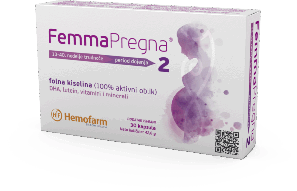 FemmaPregna 2 je dodatak ishrani namijenjen za drugi i treći trimestar trudnoće, kao i za period dojenja. Sadrži 400 μg aktivnog folata, DHA, lutein i pažljivo izabrane mikronutrijente neophodne za razvoj bebe i očuvanje zdravlja majke.