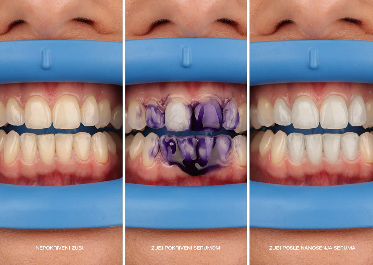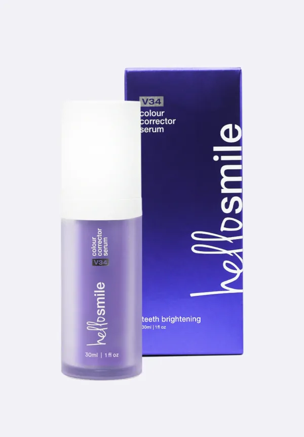 Serum napredne formulacije za izbjeljivanje zuba. V34 serum izbjeljuje zube koristeći tehnologiju korekcije boje. Korekcija boja počinje na krugu boja, gde su ljubičasta i žuta komplementarne boje jedna naspram druge. Primenom V34 seruma, neutrališu se žuti tonovi na zubima i poništavaju se, otkrivajući perceptivno svijetliju nijansu bijele boje. Neutrališe žutu boju na zubima. Neinvanzivna metoda izbjeljivanja. Bez bola i osjetljivosti zuba i desni.