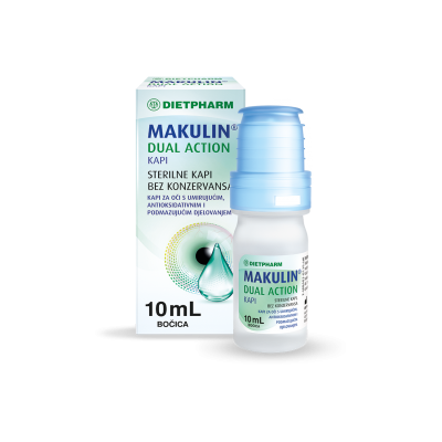 Kapi za oči s umirujućim, antioksidativnim i podmazujućim djelovanjem. Makulin® Dual Action kapi za oči su medicinski proizvod za oftalmološku upotrebu. Smanjuju nadražaj, djeluju antioksidativno, hidratizirajuće i podmazujuće te time smirujuće.