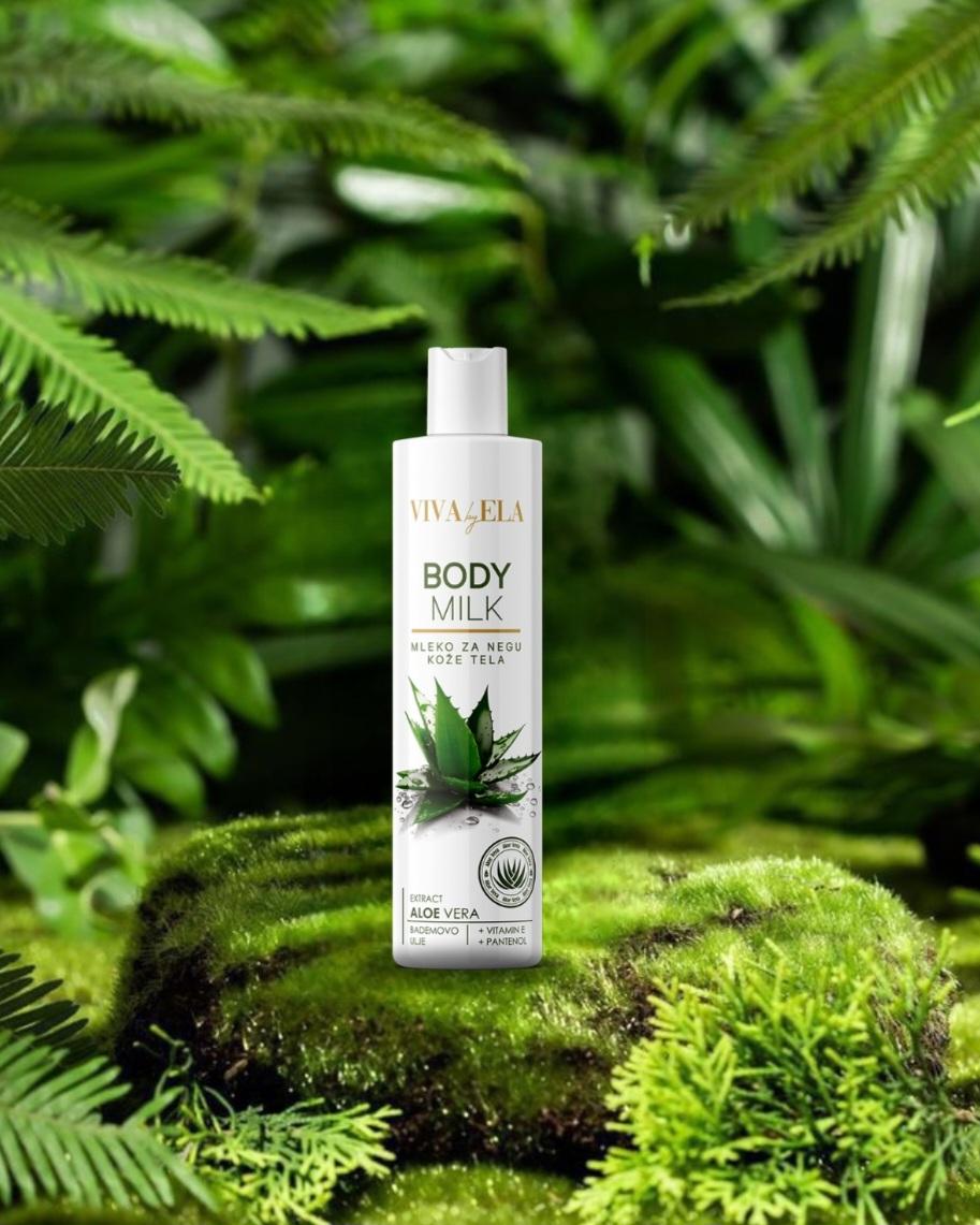 Mlijeko za telo jedinstvene formule Viva by Ela. Mlijeko za negu kože tela sa aloe vera, bademom, pantenolom i Vitaminom E. Hranljiva formula nežno neguje kožu. Koža je hidrirana i blistava. Mleko je pogodno za svaki tip kože i za celijo telijo, kao i za svakodnevnu upotrebu. Dubinski hidrira kožu i poboljšava njenu teksturu.