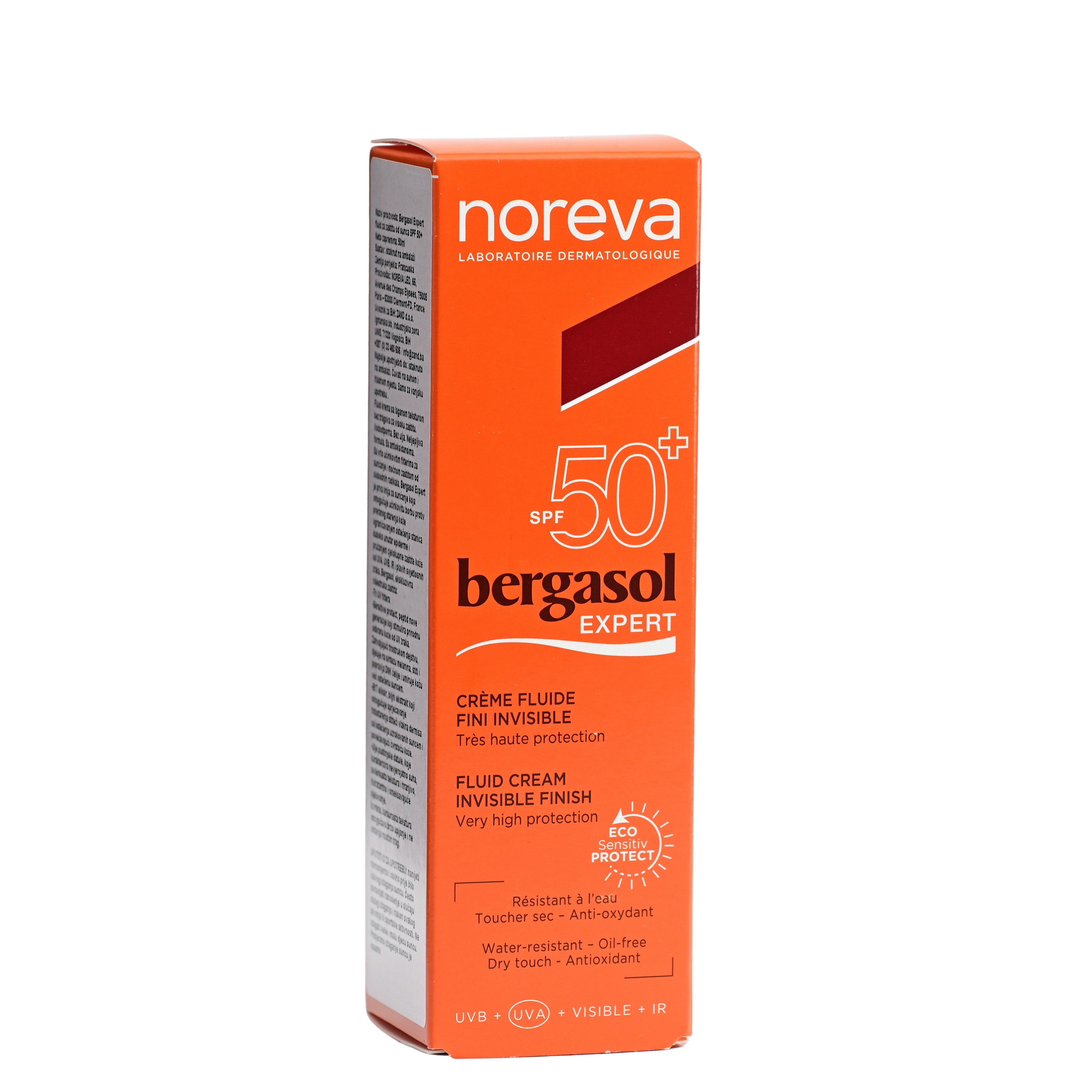 Fluid krema sa laganom teksturom bez tragova za visoku zaštitu. Sa vrlo učinkovitim filterima za sunčanje i moćnom zaštitom od slobodnih radikala. Bergasol Expert je prva linija za sunčanje koja omogućuje učinkovitu borbu protiv preranog starenja kože ograničavanjem oštećenja stanica duboko unutar epiderme i pružanjem cjelokupne zaštite kože od UVA, UVB, IR i plavih svjetlosnih zraka. Bergasol, ekskluzivna višestruka zaštita: Tri UV filtera Sensitive protect, peptid nove generacije koji stimulira prirodnu odbranu kože od UV zraka Vodootporno Bez ulja Neljepljiva formula Zahvaljujući trostrukom dejstvu, djeluje na sintezu melanina, štiti i popravlja DNK ćelije i umiruje kožu već oštećenu suncem. – B17 eliksir, biljni ekstrakt koji omogućuje sprječavanja fotostarenja štiteći vlakna dermisa od oštećenja uzrokovanih suncem i povećavajući čvrstoću kože. – Ulje pustinjske datule, koje karakterizira nevjerovatno suha, svilenkasta tekstura i hranjivo, hidratantno i omekšavajuće djelovanje. Izvrsna, baršunasta tekstura omogućava brzo upijanje i ne ostavlja mastan trag. Pakovanje: 50ml Primjena: Nanijeti ravnomjerno i obilno prije bilo kakvog izlaganja suncu.