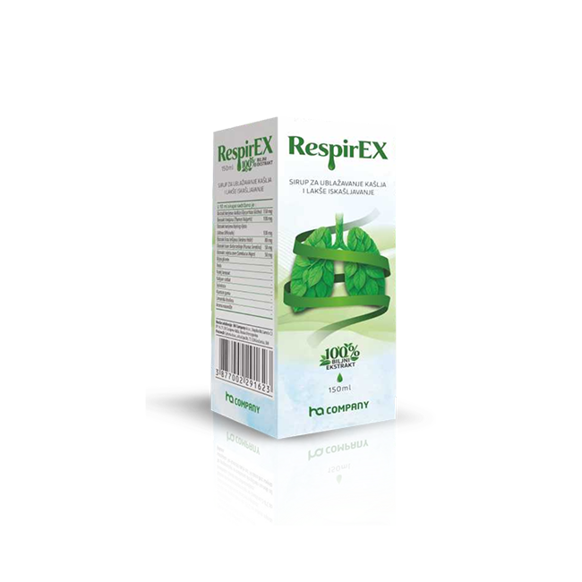 RespirEX je biljni sirup koji kombinuje ekstrakte ljekovitih biljaka djelujući na umirivanje nadraženog grla i smanjenje refleksa kašlja, olakšavanje disajnih puteva, smanjenje iritacije sluznice, ublažavanje simptoma prehlade i gripe.