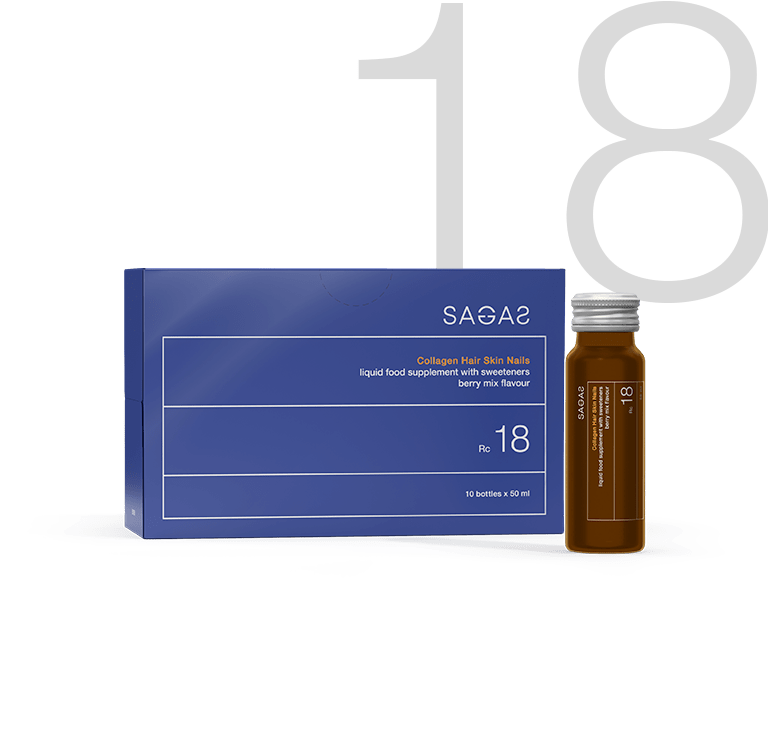 Svaka dnevna doza (50 ml) Sagas Rc 18 Collagen Hair Skin Nails sadrži 15.000 mg Peptan® hidroliziranog morskog kolagena. Takođe sadrži 100 mg hijaluronske kiseline i 450 mg ekstrakta ploda Acerole – prirodnog izvora vitamina C te biotin i cink. Vitamin C doprinosi normalnom stvaranju kolagena za normalnu funkciju kože, cink doprinosi normalnoj sintezi proteina i DNA te doprinosi održavanju normalnih kostiju, kose, kože, noktiju i vida, dok biotin doprinosi održavanju zdrave kose, kože i sluznica. Ova sinergija sastojaka osigurava snažnu antioksidativnu zaštitu i potiče stvaranje prirodnog kolagena, pružajući vam cjelovitu njegu iznutra.