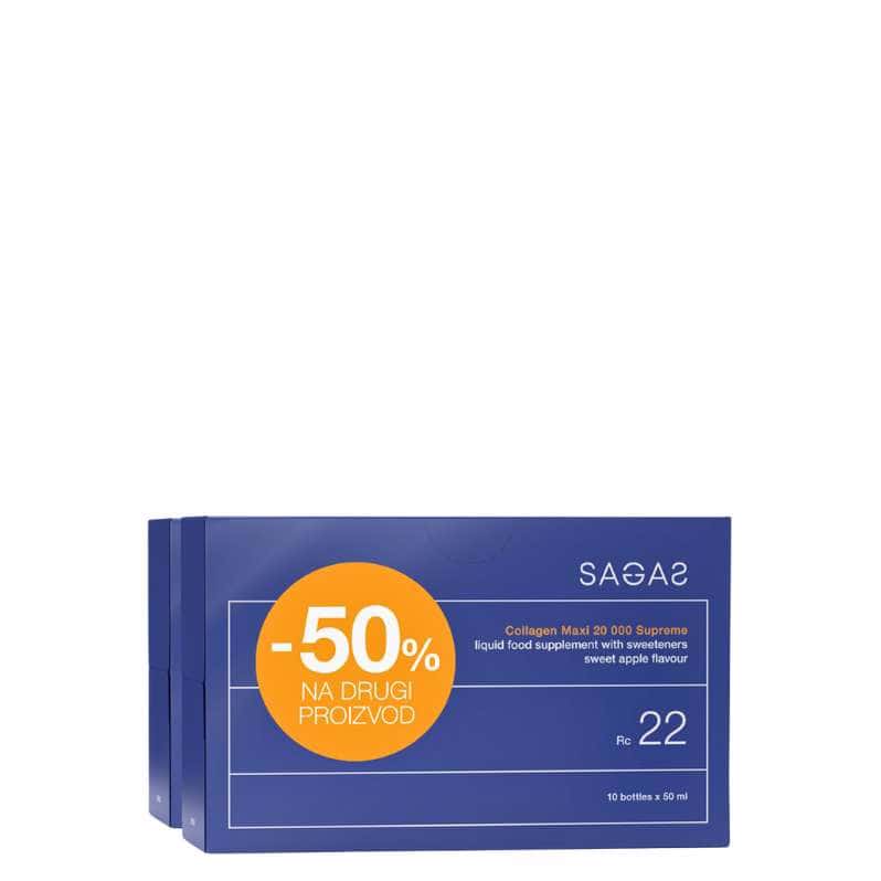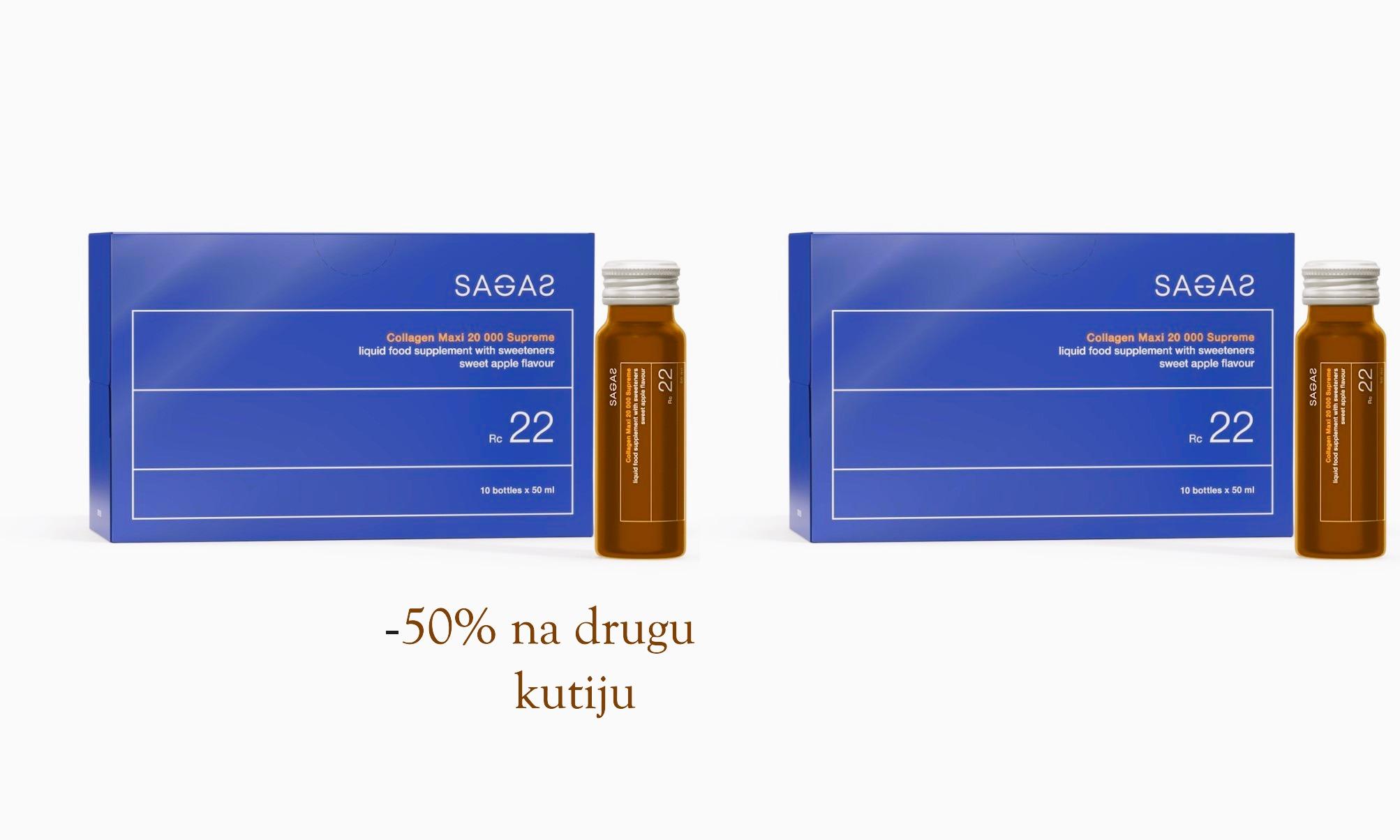 Sagas Rc 22 Collagen Maxi 20 000 Supreme – tečni kolagen pakovan je u praktične bočice od 50 ml. Brza i jednostavna upotreba omogućena je direktnom konzumacijom iz bočice ili miješanjem sa sokom, vodom ili smoothiejem. Zahvaljujući naprednoj tehnologiji, prirodan okus kolagena se učinkovito prikriva, čime se ističe svjež i izražen okus jabuke koji čini proizvod izuzetno ugodnim za konzumaciju. Sadrži vrlo visoku dnevnu dozu kolagena – 20.000 mg – što doprinosi stimulaciji prirodne sinteze kolagena, poboljšava elastičnost kože, a takođe pomaže u smanjenju bora, pružajući vam mladolik izgled.