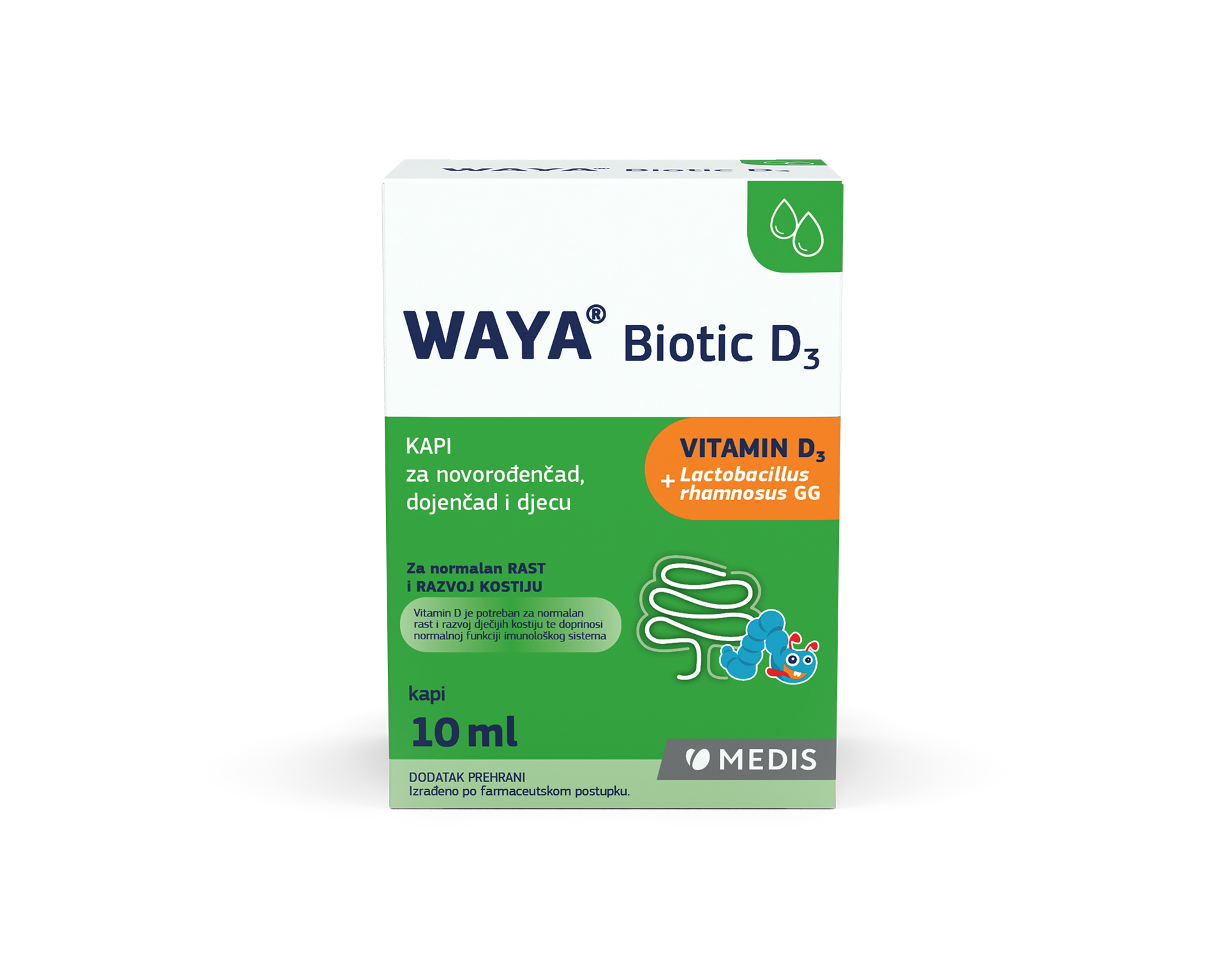 7 kapi sadrži potrebnu dnevnu količinu vitamina D prema preporukama pedijatara (400 I. J.). 7 kapi sadrži najmanje 1,4 milijarde ćelija mikroinkapsuliranog probiotičkog soja Lactobacillus rhamnosus GG.